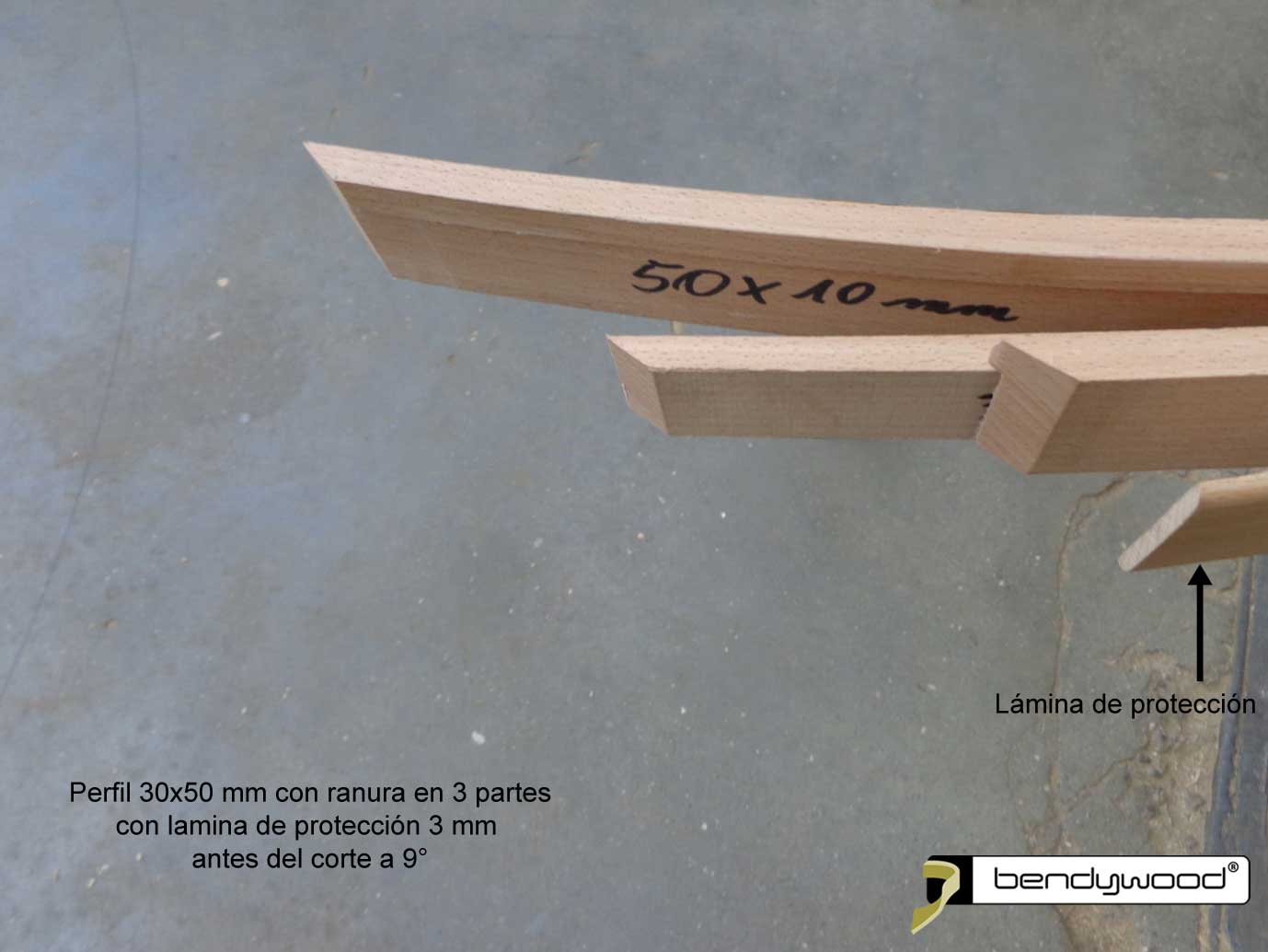 Las partes finales de las láminas se tienen que cortar una por una – siempre a 9° – en largos diferentes. Por qué? El Bendywood® – cuando se dobla – se alarga en el exterior y se comprime en el interior. Sólo el eje del perfil mantiene la longitud cortada y esto debe tenerse en cuenta.