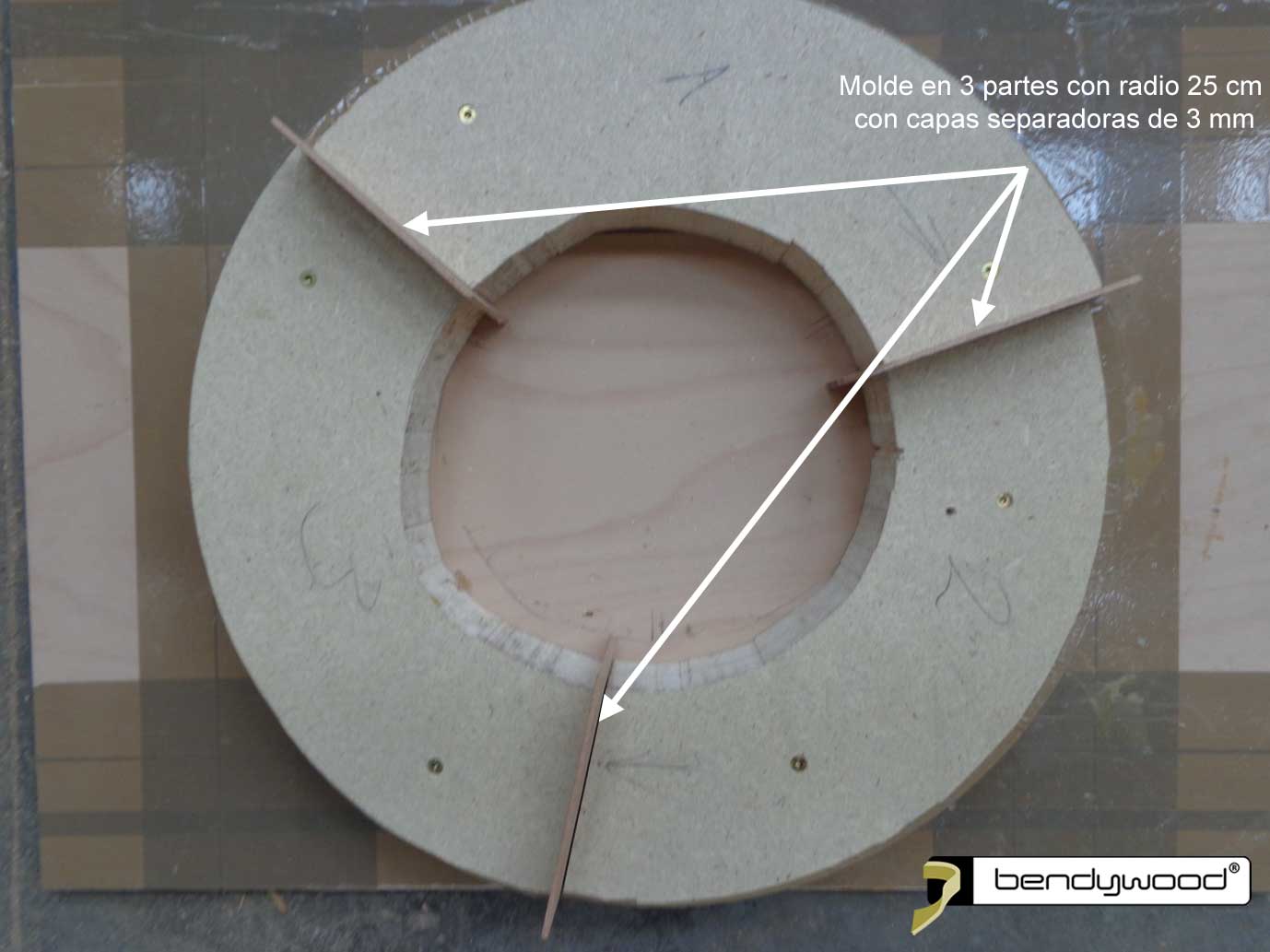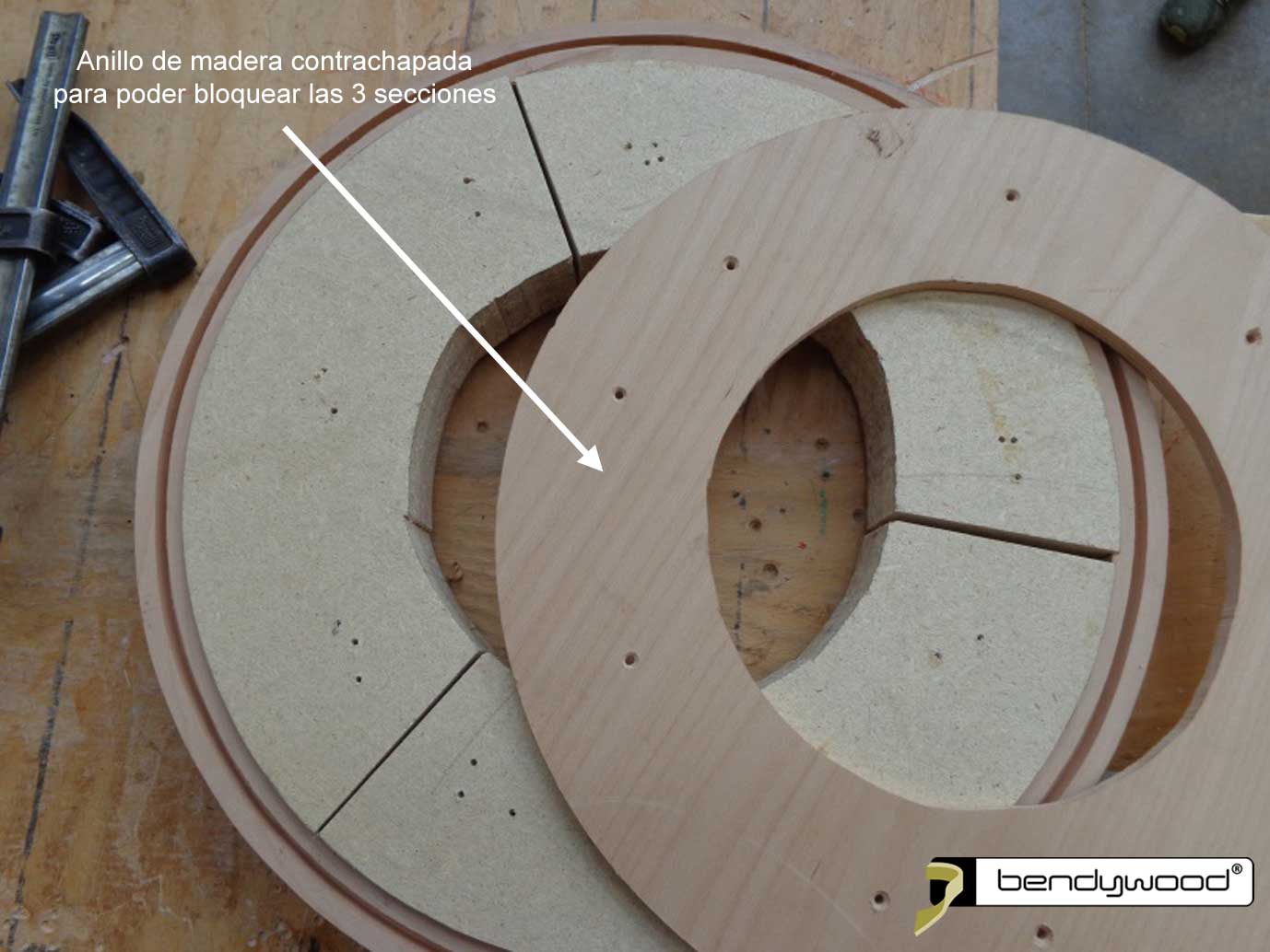 - Construir un molde en 3 partes – véase abajo – con un radio de 25 cm y un anillo de madera contrachapada para poder bloquear las 3 secciones de la plantilla. Cubrir el borde con cinta adhesiva protectora. Preparar una lista Bendywood® de protección del borde exterior de 3x40 mm aprox.