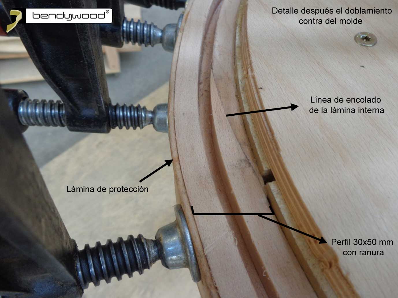 El radio de doblamiento de 25 cm está demasiado estrecho para poder doblar un perfil con espesor de 30 mm. El Bendywood® se puede doblar únicamente hasta 20 veces su espesor, entonces un espesor de 30 mm se dobla hasta un radio de 60 cm. Para poder doblar hasta un radio de 25 cm, se tiene que seccionar el perfil en 3 láminas con espesor 10 mm.