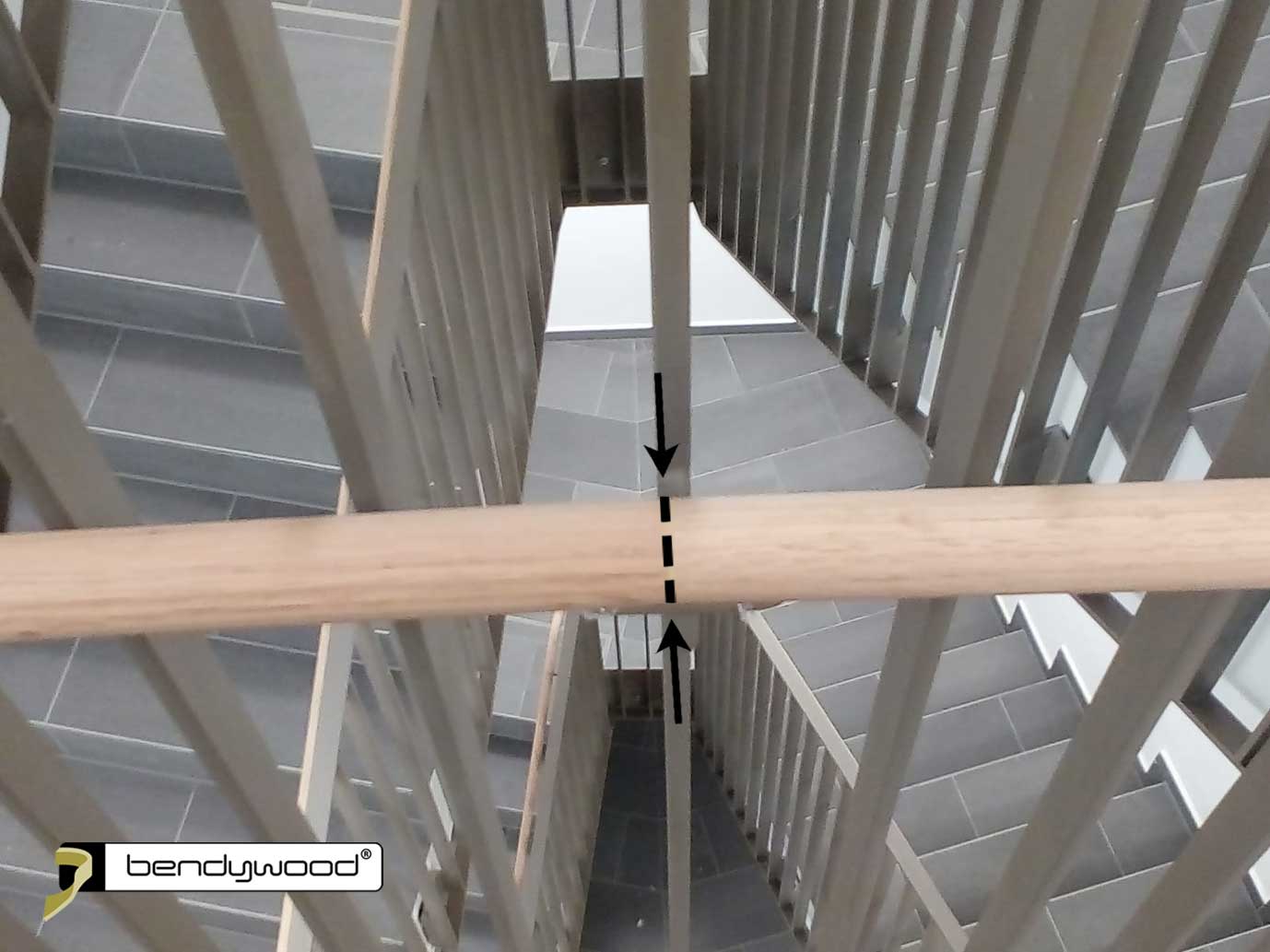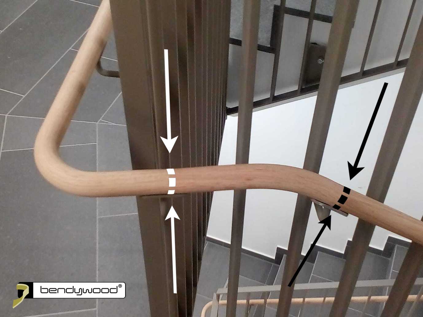 - Au cas où la main courante serait vissée sur un fer plat continu de la balustrade (par le bas) à des intervalles d'environ 20 cm. Seulement ce type de montage empêche le rétrécissement en longueur : cependant n'utilisez que des vis solides et profondément pénétrantes, notamment pour les mains courantes avec un diamètre de ø42 mm ou plus